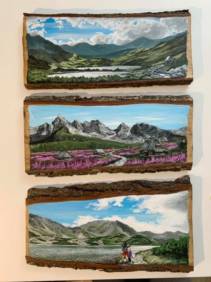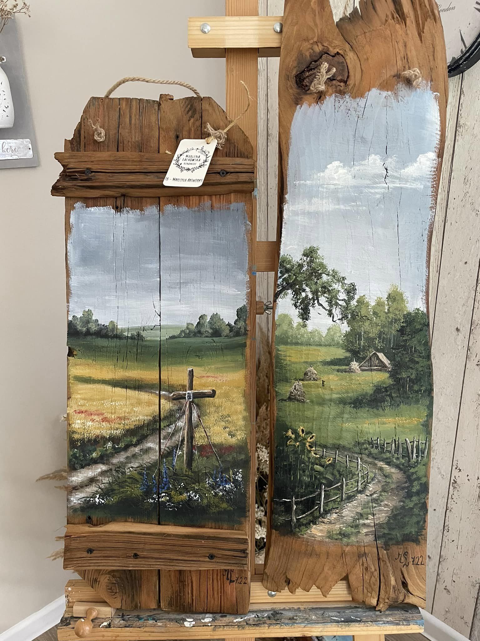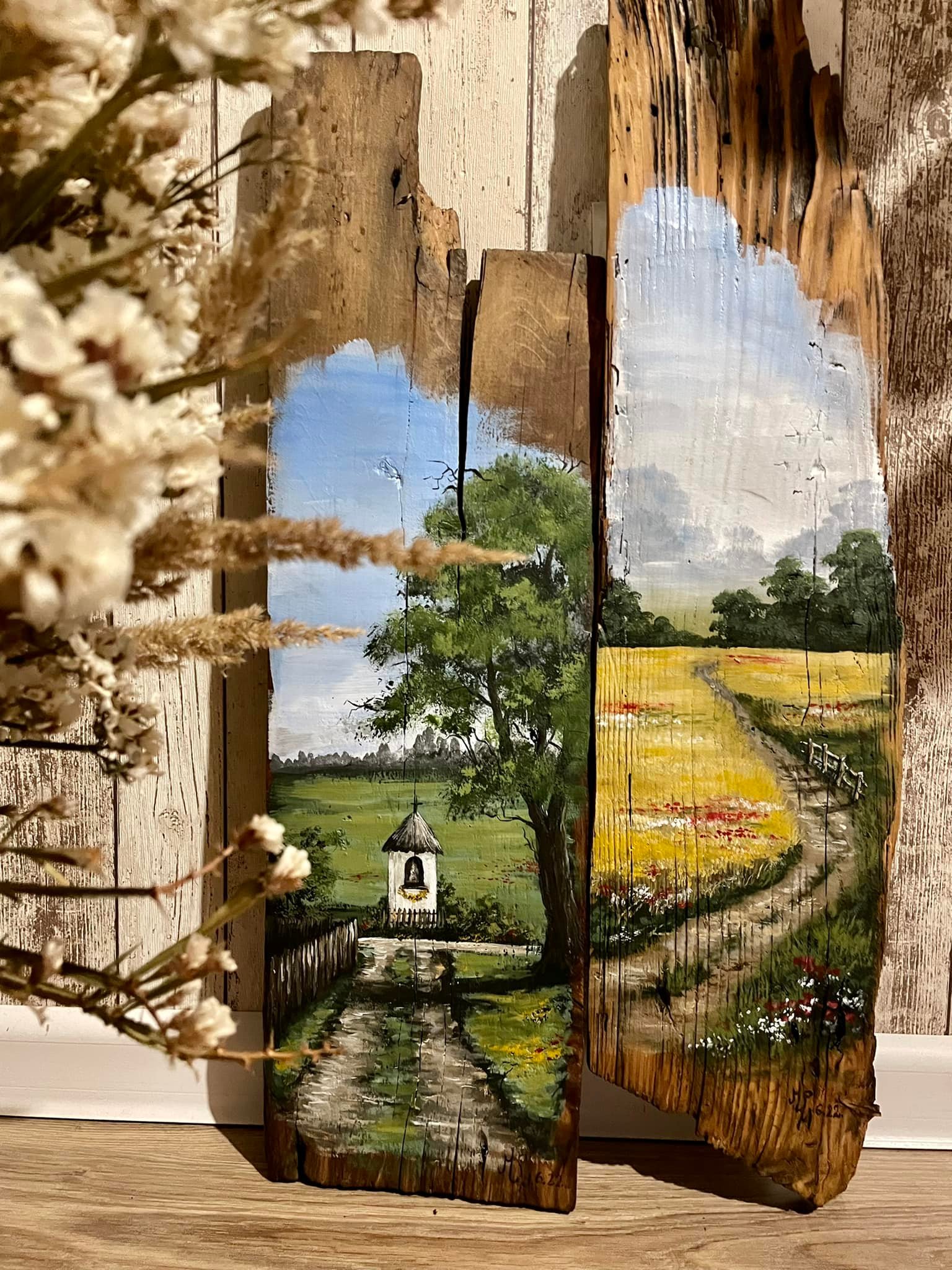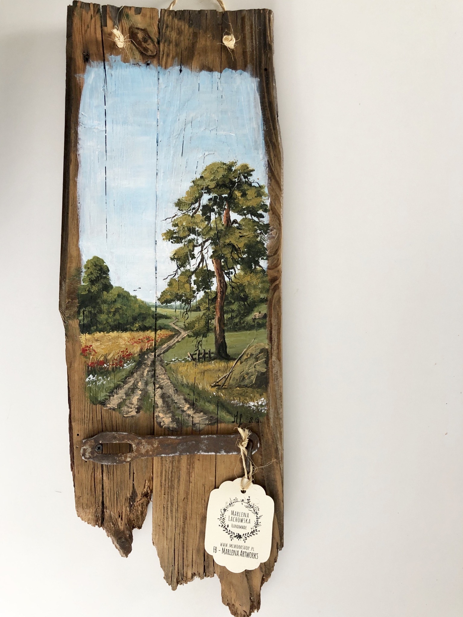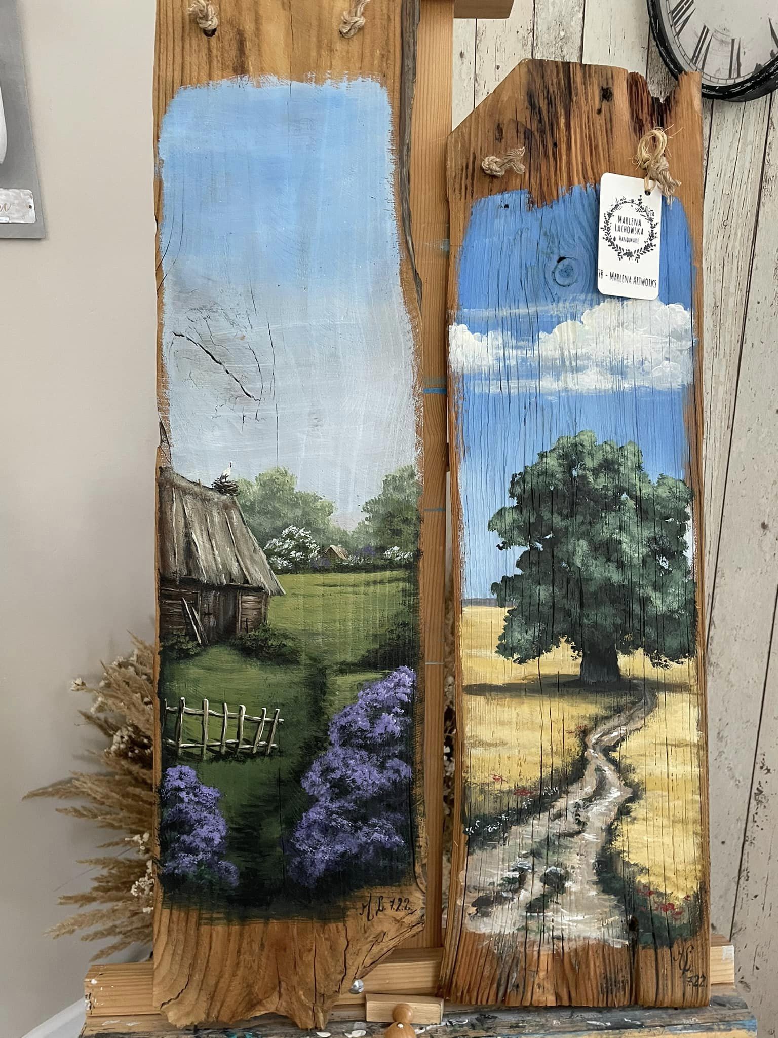 Obrazy, które tu widzisz wykonuję farbami akrylowymi na naturalnych deskach najczęściej dębowych z korą lub bez. Każda z nich jest inna, niepowtarzalna, ma inne słoje, inny zapach, inny kształt i fakturę. Największą przyjemność sprawia mi jednak odnawianie i konserwacja starych, wiekowych, porozbiórkowych desek, stanowiące świetne podobrazie.