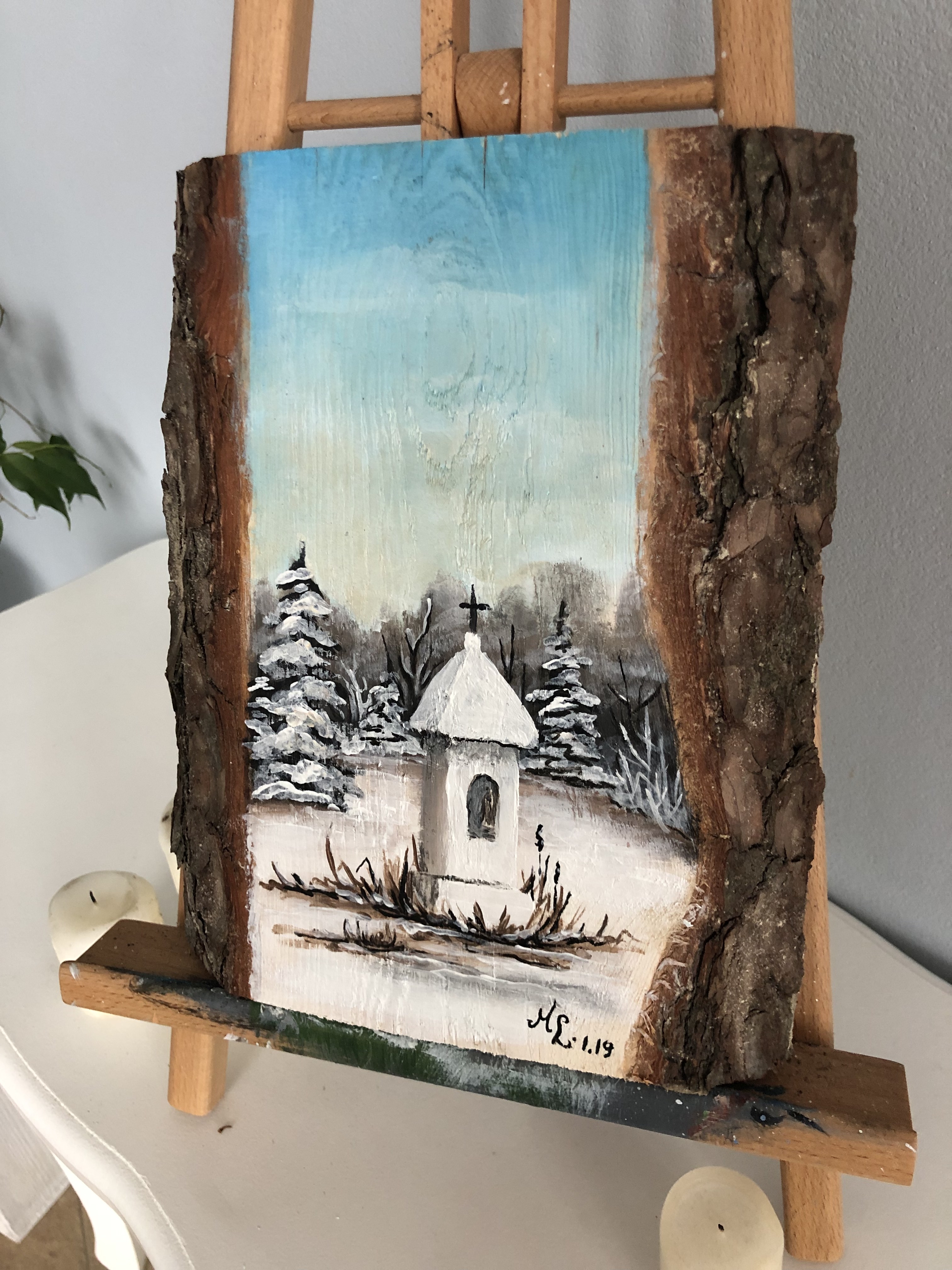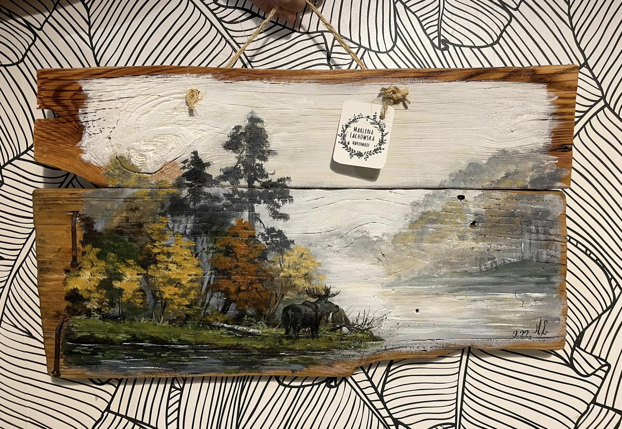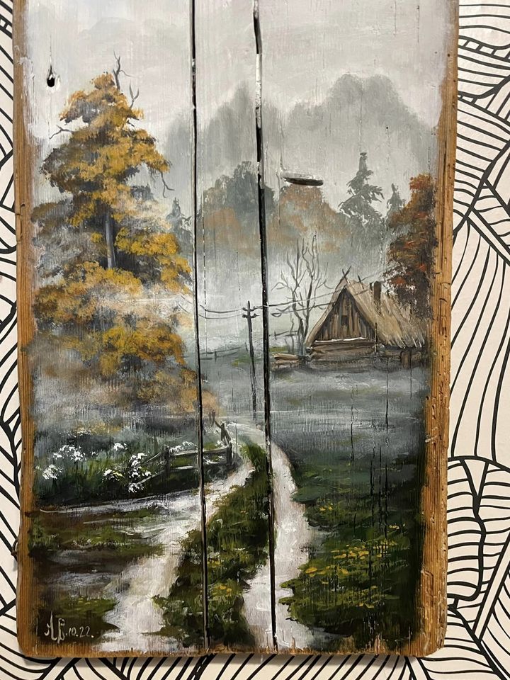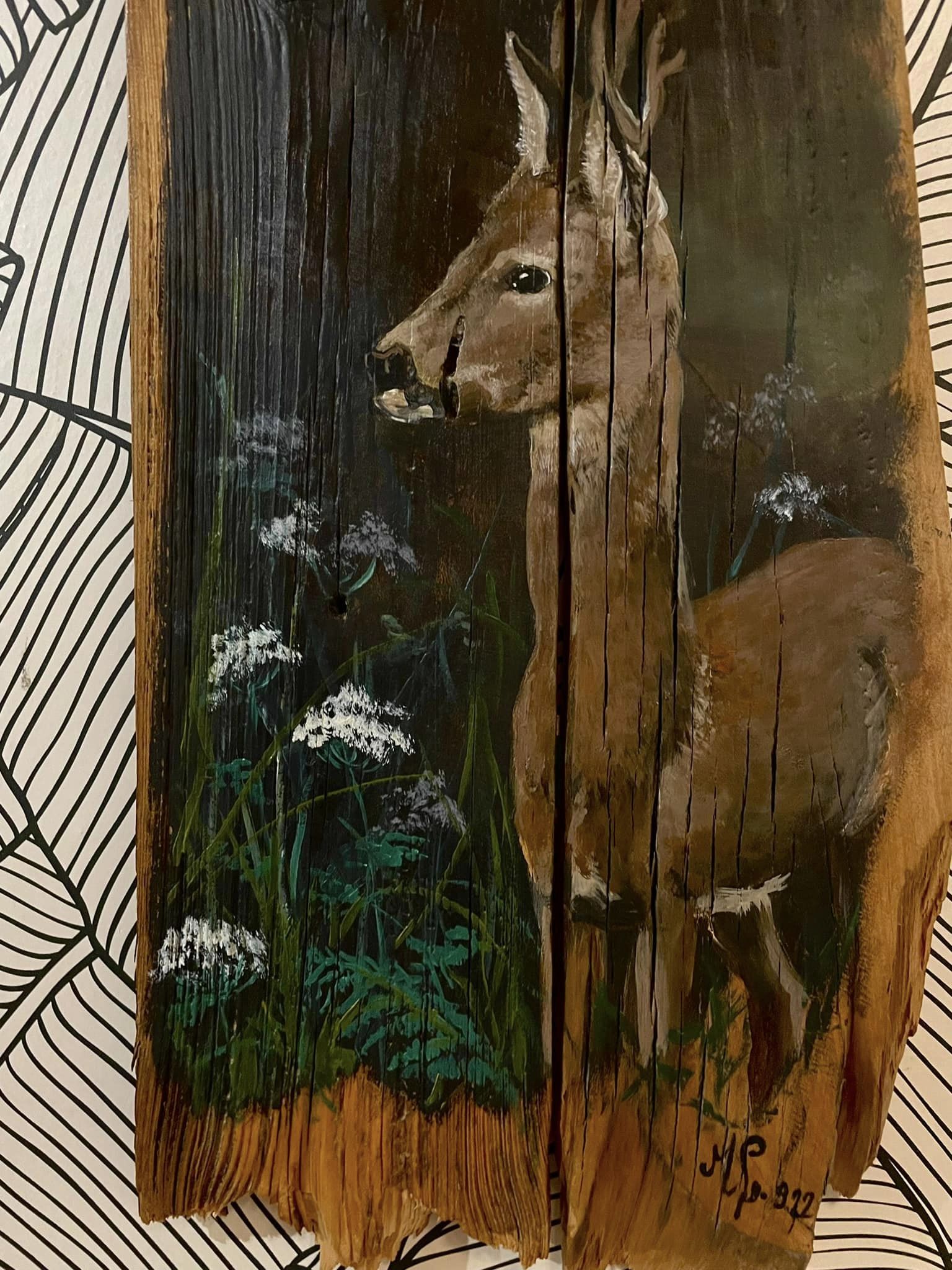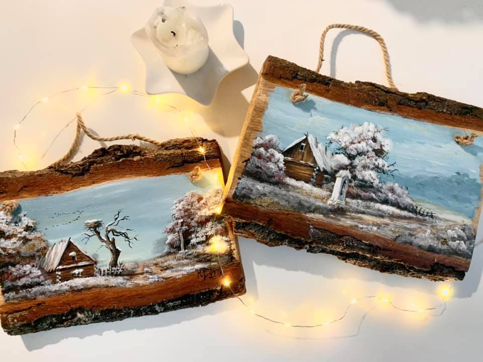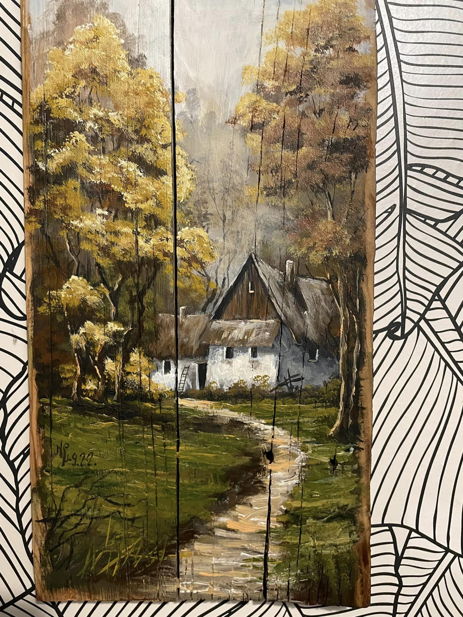 Obrazy, które tu widzisz wykonuję farbami akrylowymi na naturalnych deskach najczęściej dębowych z korą lub bez. Każda z nich jest inna, niepowtarzalna, ma inne słoje, inny zapach, inny kształt i fakturę. Największą przyjemność sprawia mi jednak odnawianie i konserwacja starych, wiekowych, porozbiórkowych desek, stanowiące świetne podobrazie.