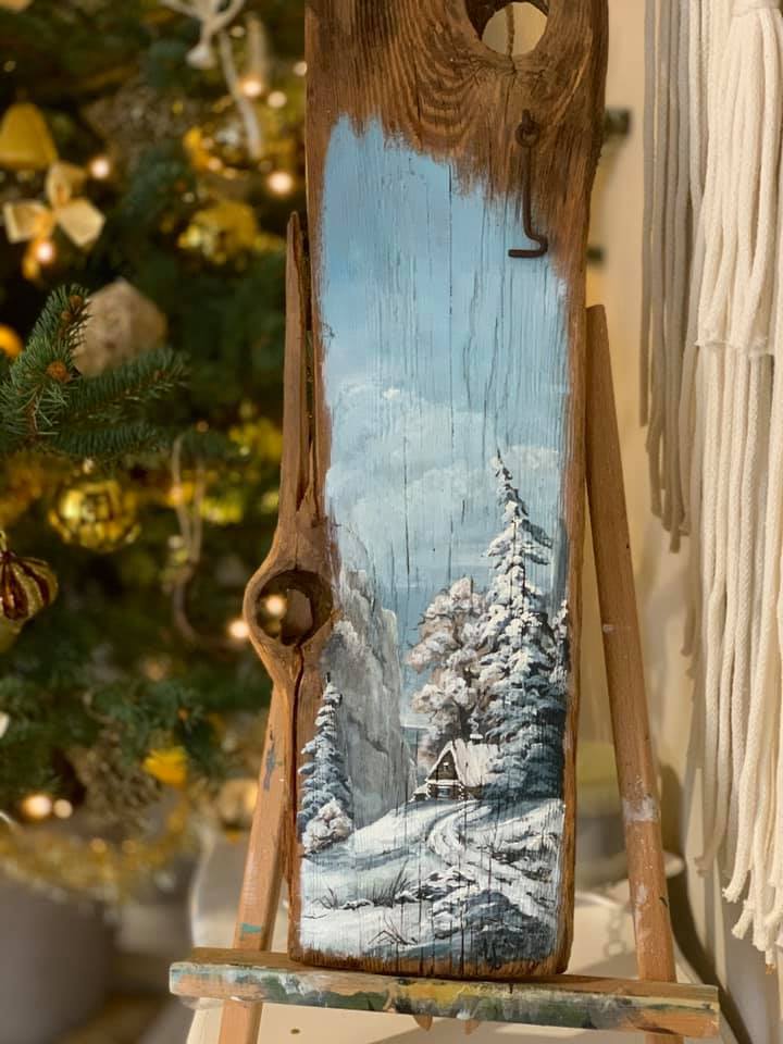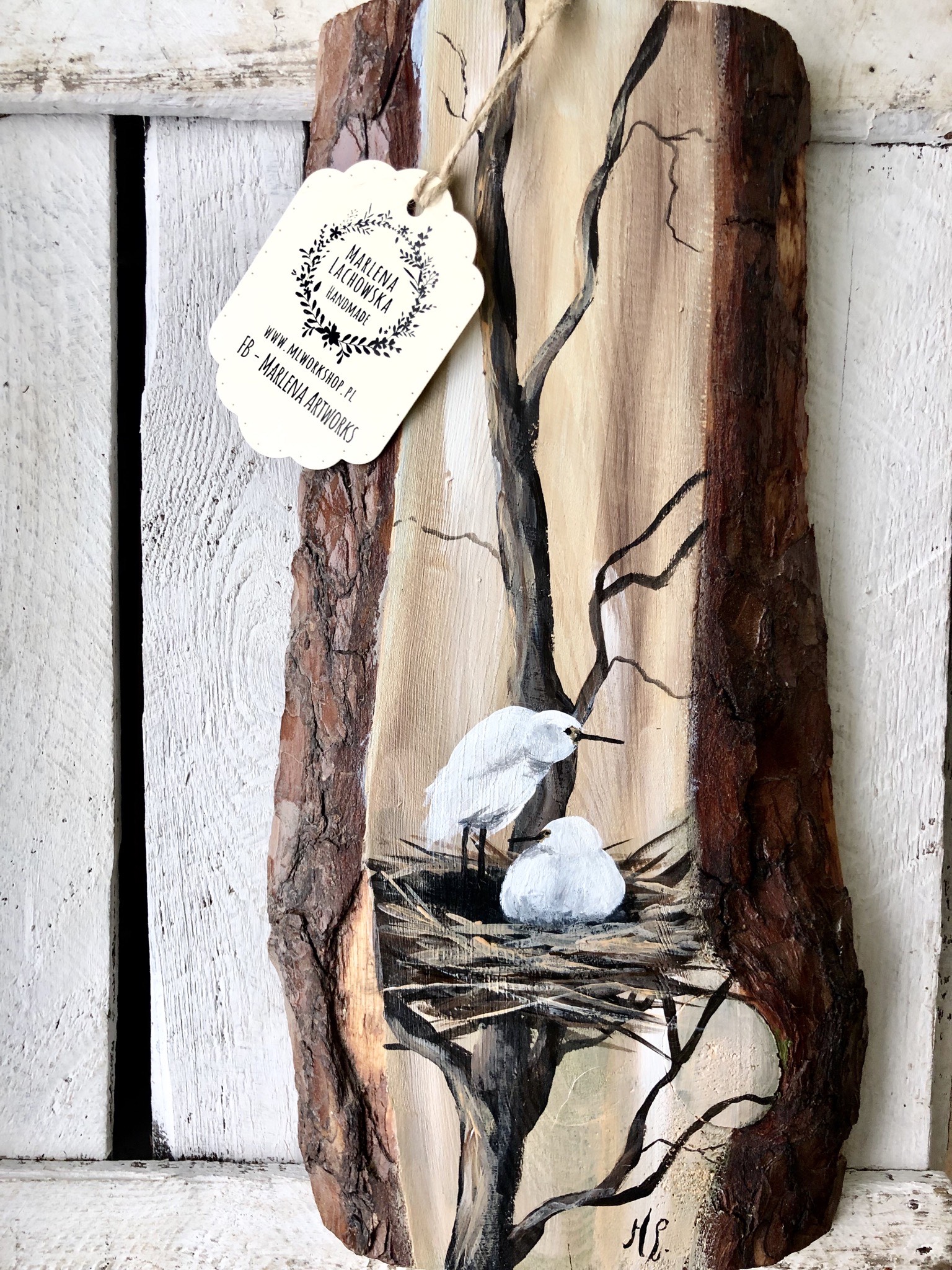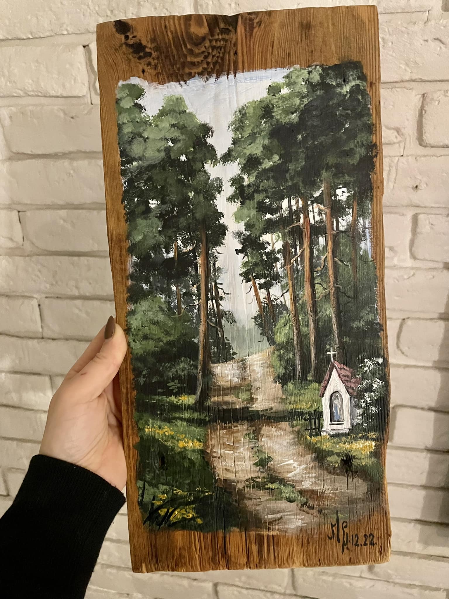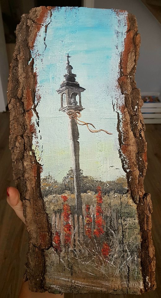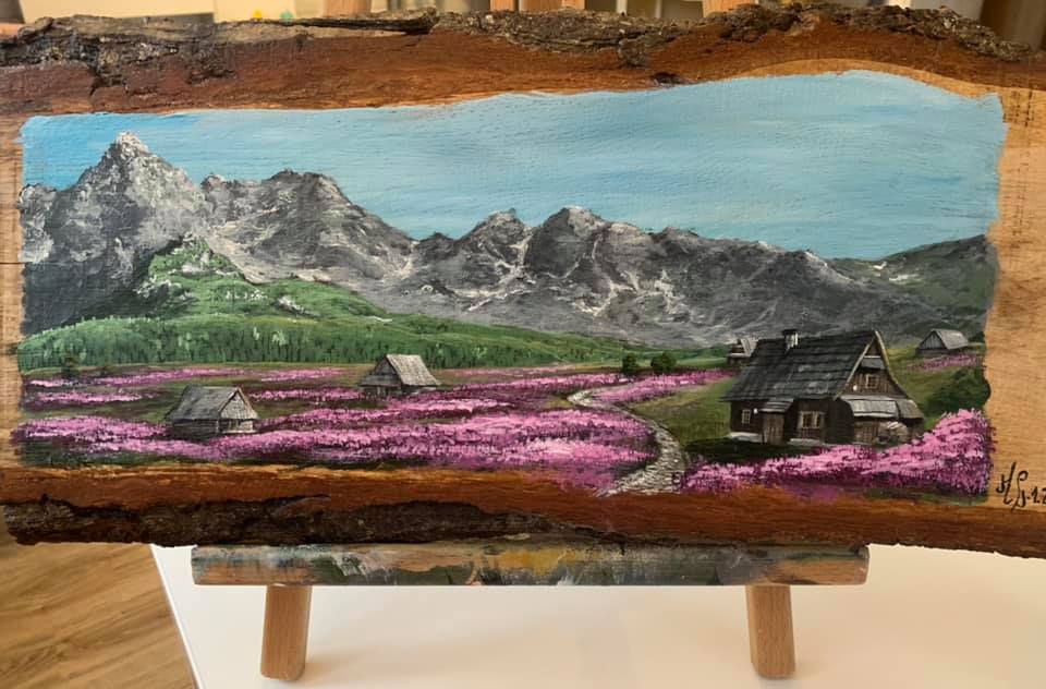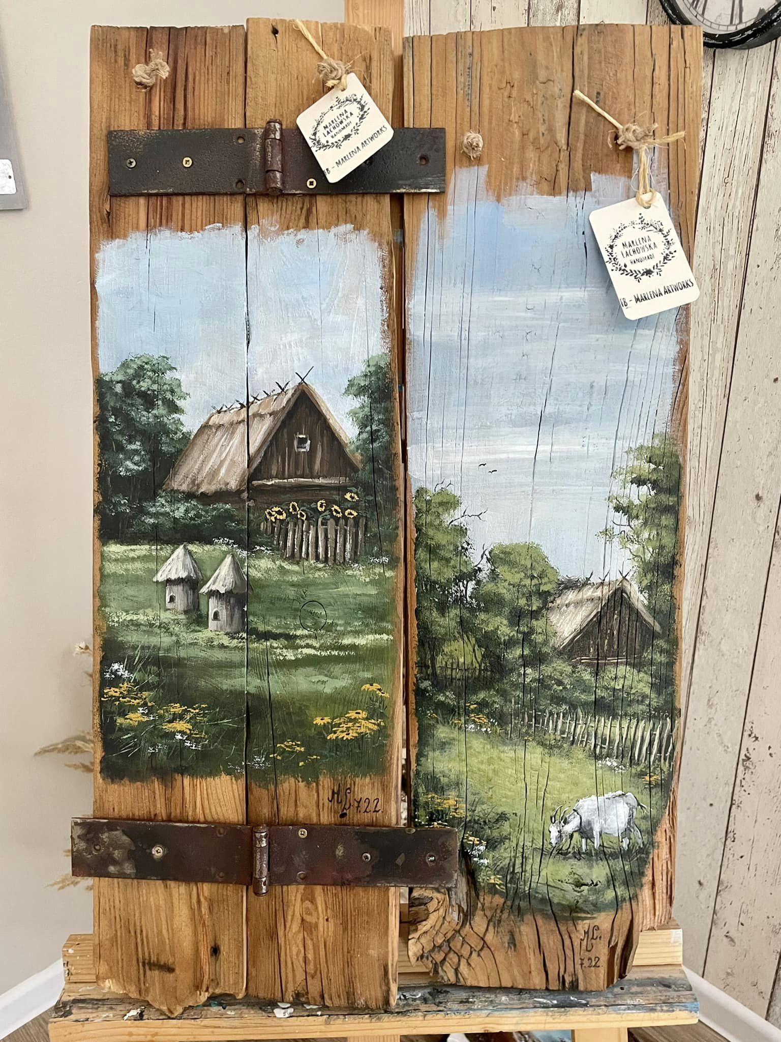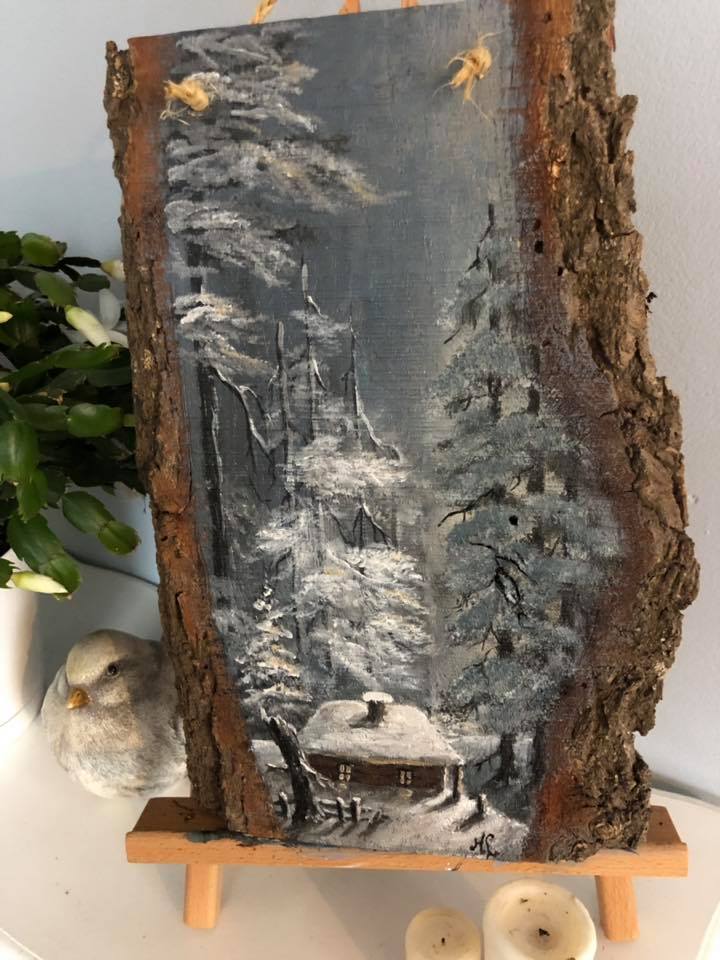 Obrazy, które tu widzisz wykonuję farbami akrylowymi na naturalnych deskach najczęściej dębowych z korą lub bez. Każda z nich jest inna, niepowtarzalna, ma inne słoje, inny zapach, inny kształt i fakturę. Największą przyjemność sprawia mi jednak odnawianie i konserwacja starych, wiekowych, porozbiórkowych desek, stanowiące świetne podobrazie.