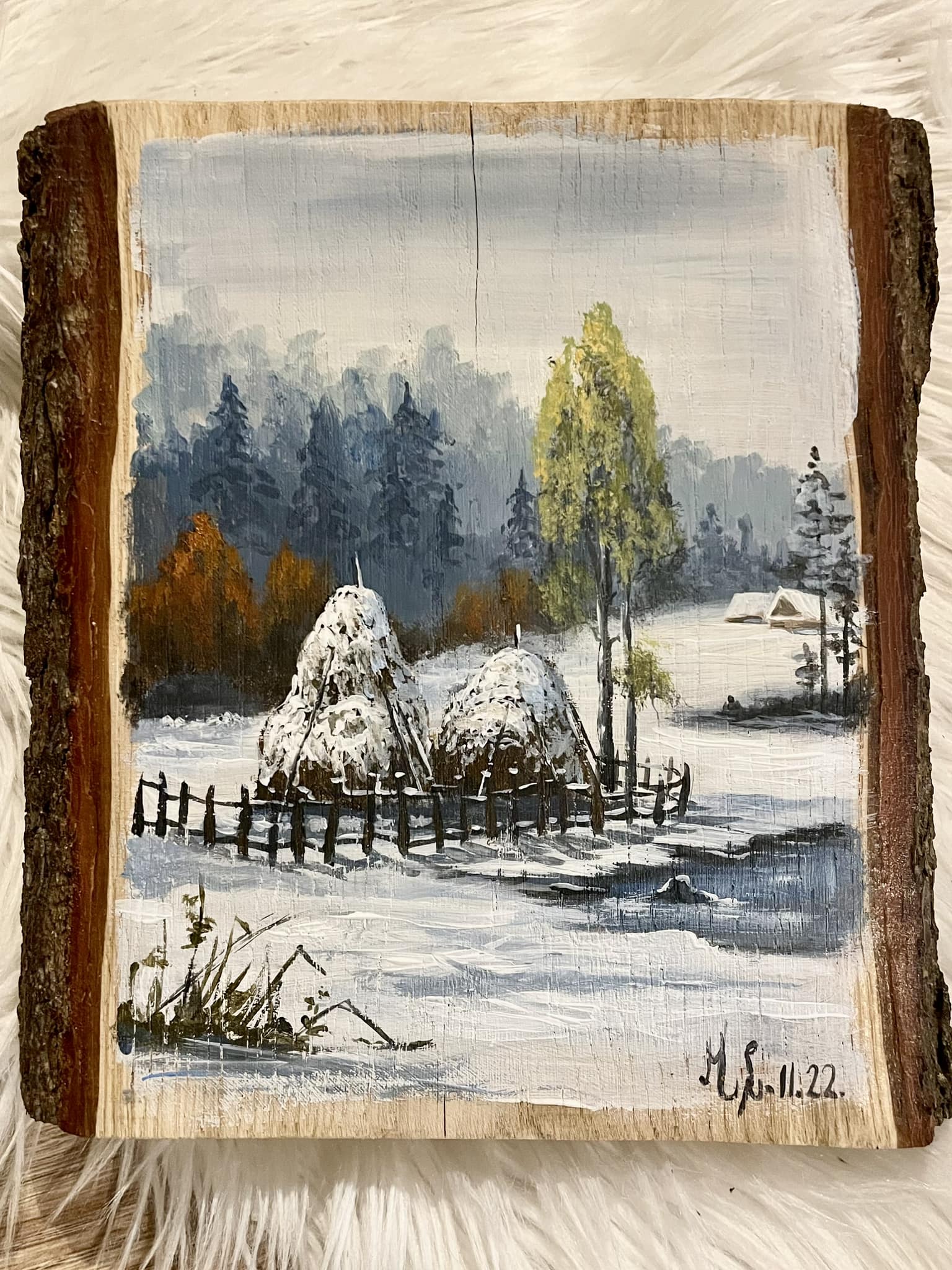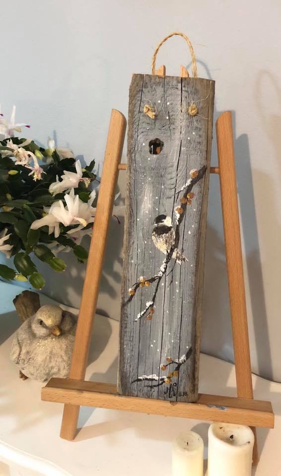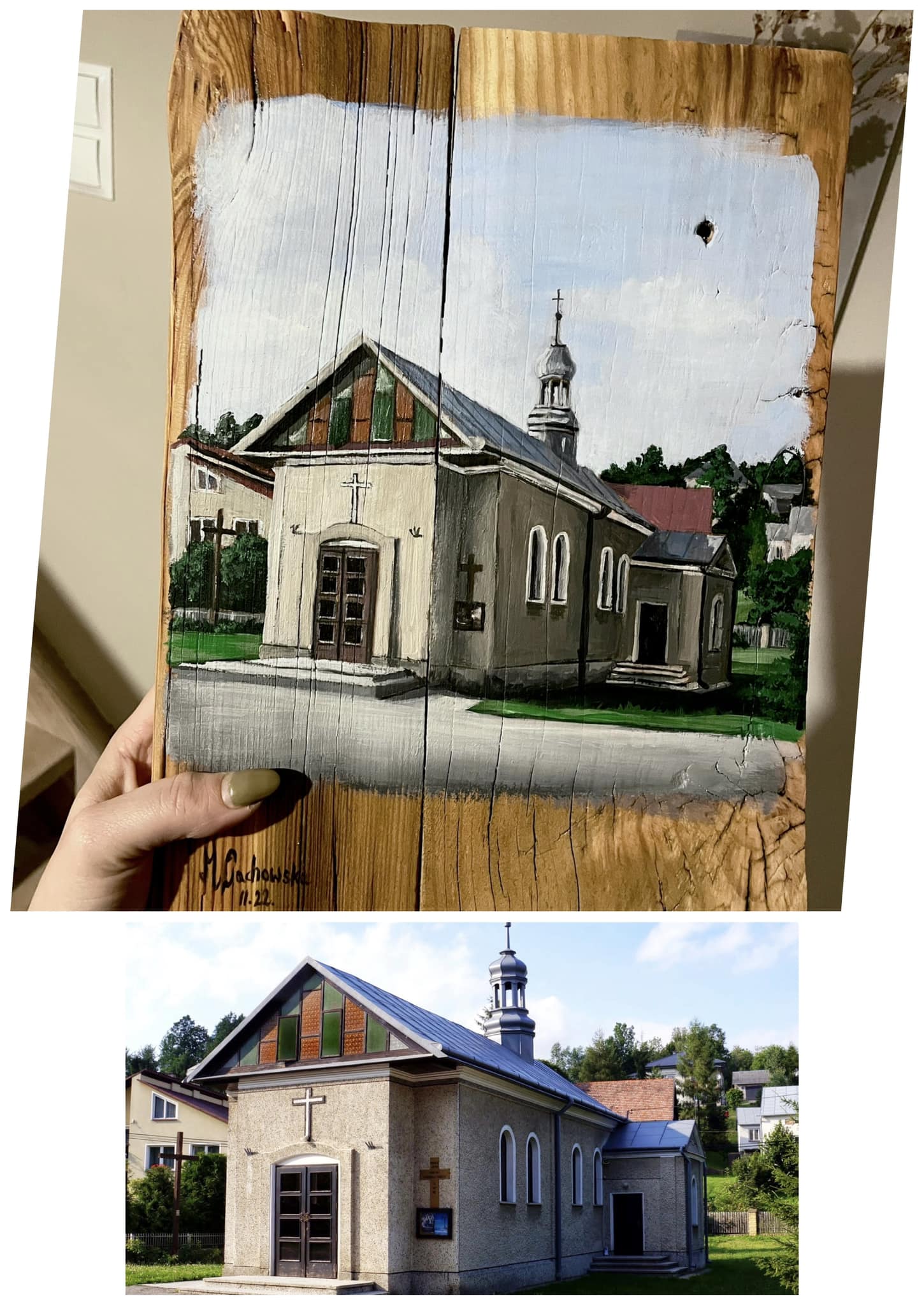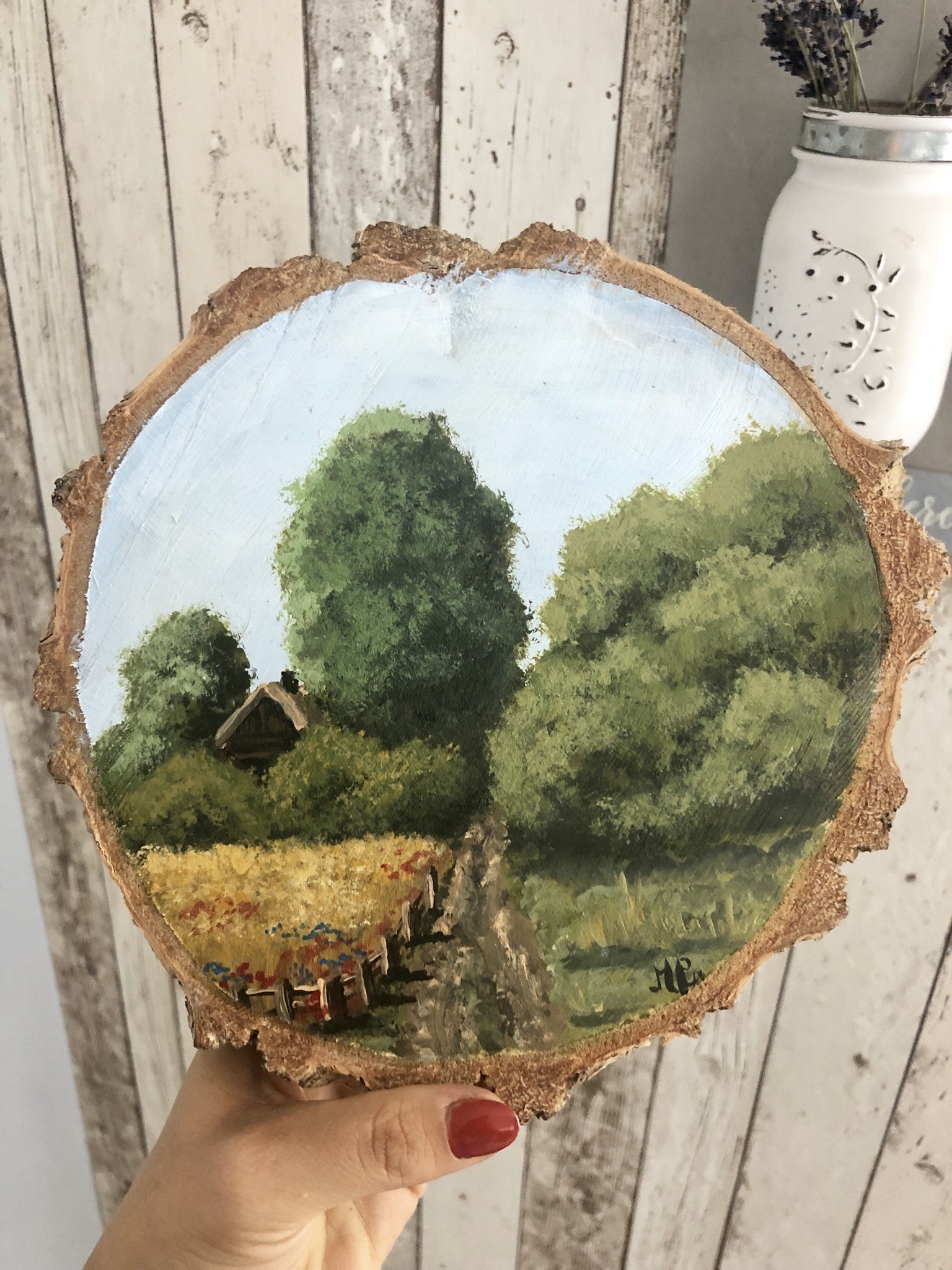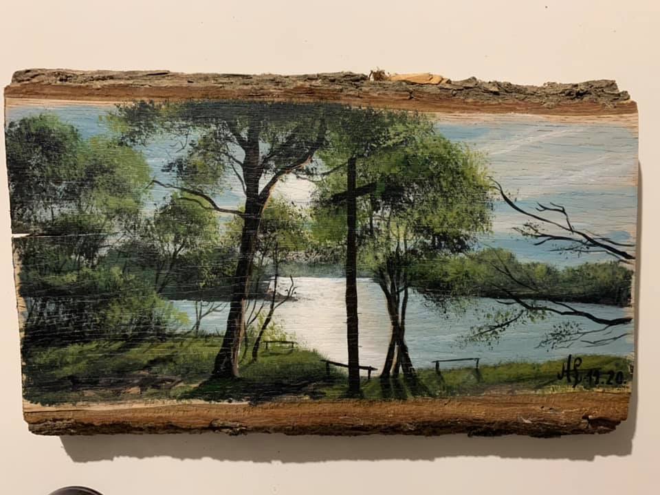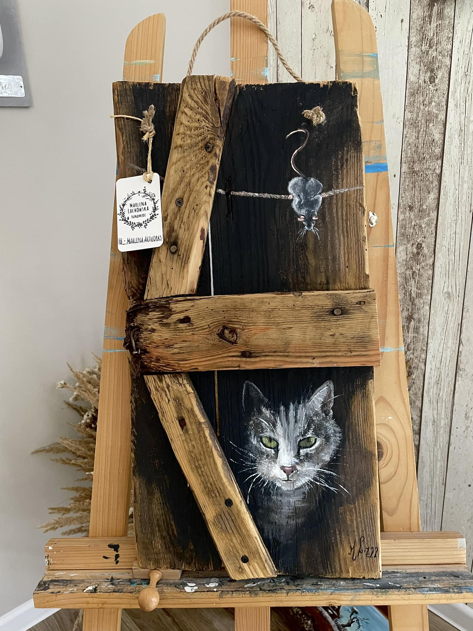 Obrazy, które tu widzisz wykonuję farbami akrylowymi na naturalnych deskach najczęściej dębowych z korą lub bez. Każda z nich jest inna, niepowtarzalna, ma inne słoje, inny zapach, inny kształt i fakturę. Największą przyjemność sprawia mi jednak odnawianie i konserwacja starych, wiekowych, porozbiórkowych desek, stanowiące świetne podobrazie.